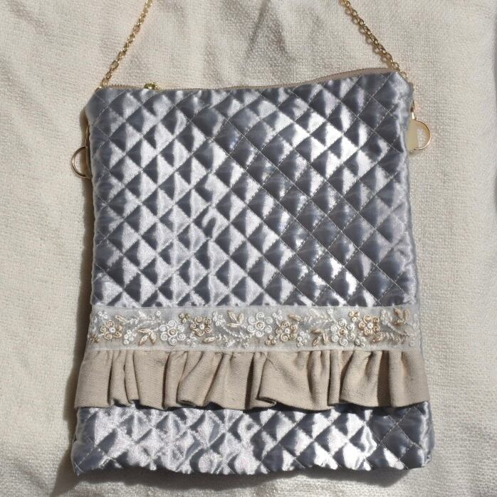 柔らかな生成り色のフリルとブレードをつけたショルダーバッグです。