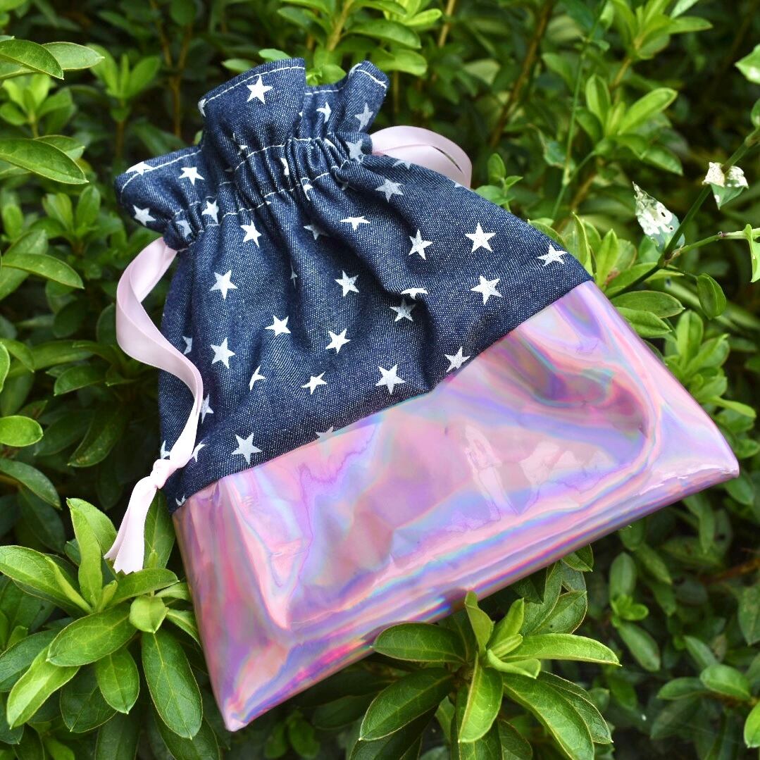星柄デニムとつやつやエナメルの巾着ポーチ
