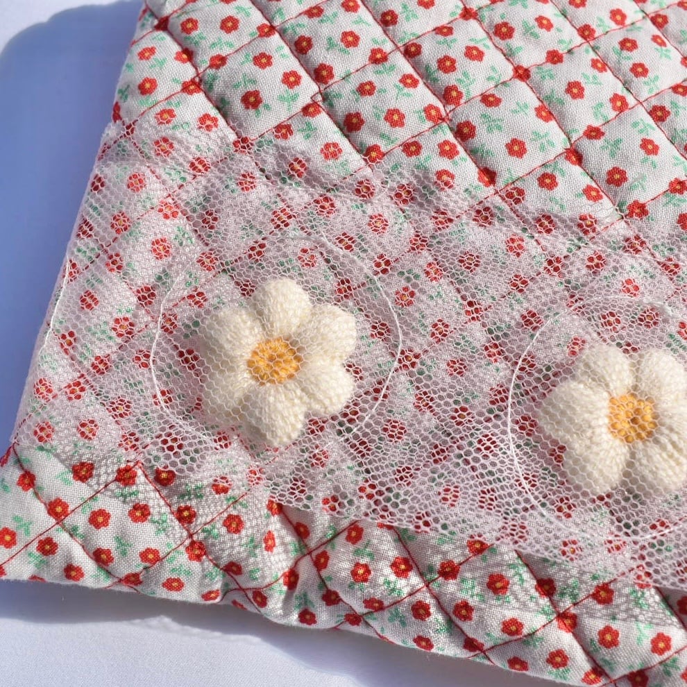 チュール生地にお花を閉じ込めて、フリルのように縫い付けました。