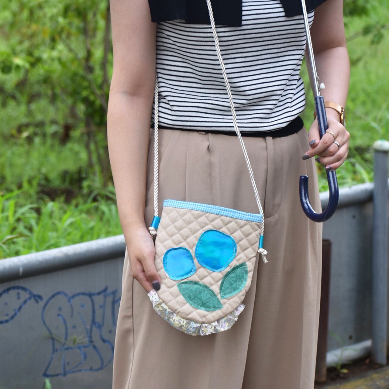 丸底でちょこっと出ているレースが素敵なショルダーバッグです。お花の形は他に比べてころっとしているタイプですね。1つ1つ手で作っているからこその自然な曲線が愛しいです。