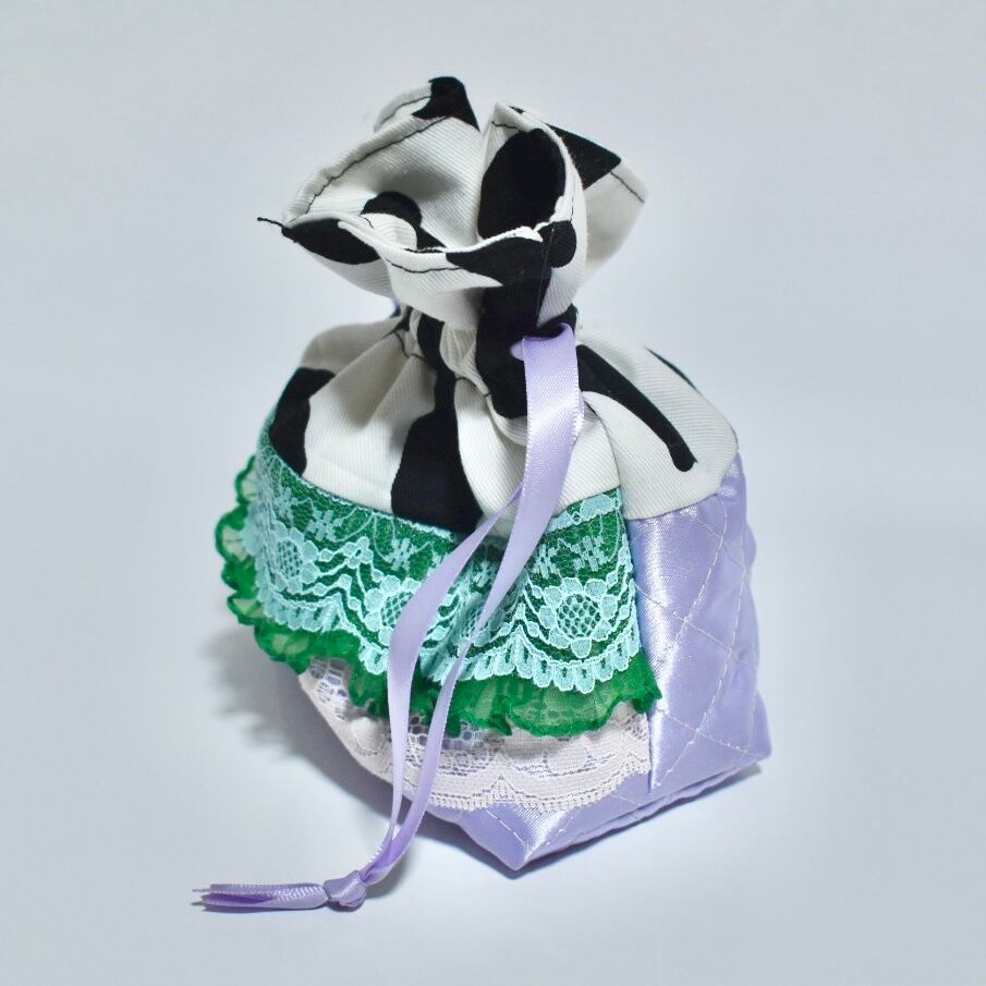 牛柄×キルティングのミニ巾着ポーチです。アクセントにレースを2つつけたことでよりキュートなデザインに仕上げました◎