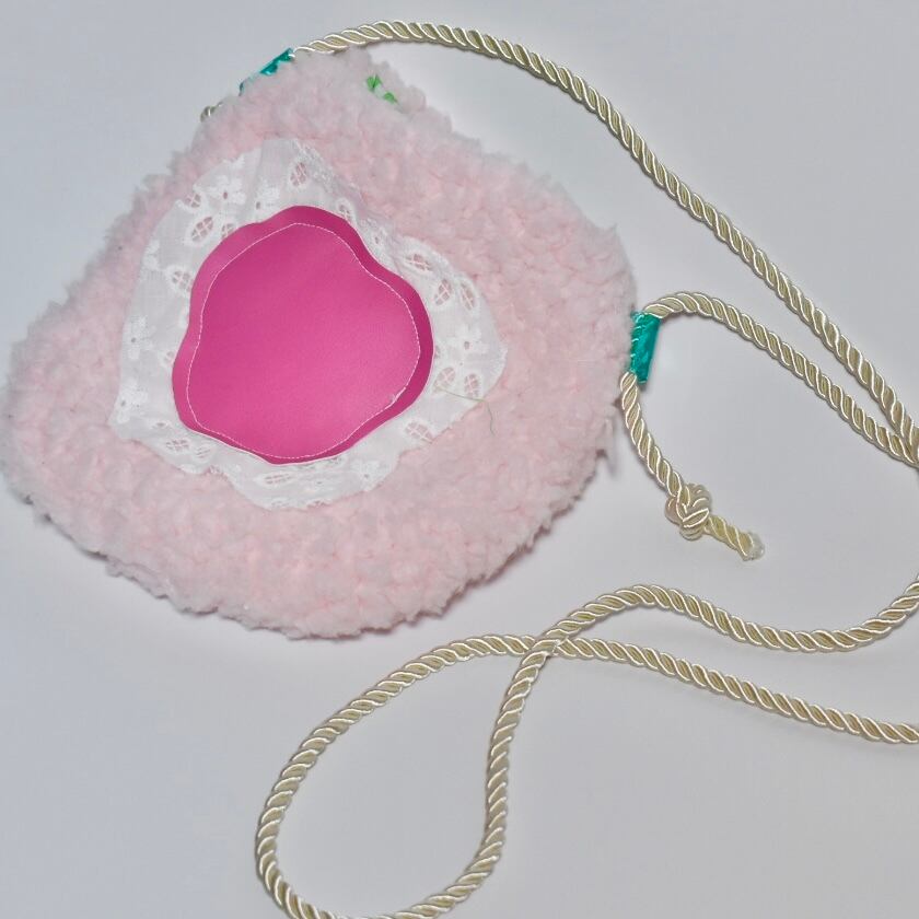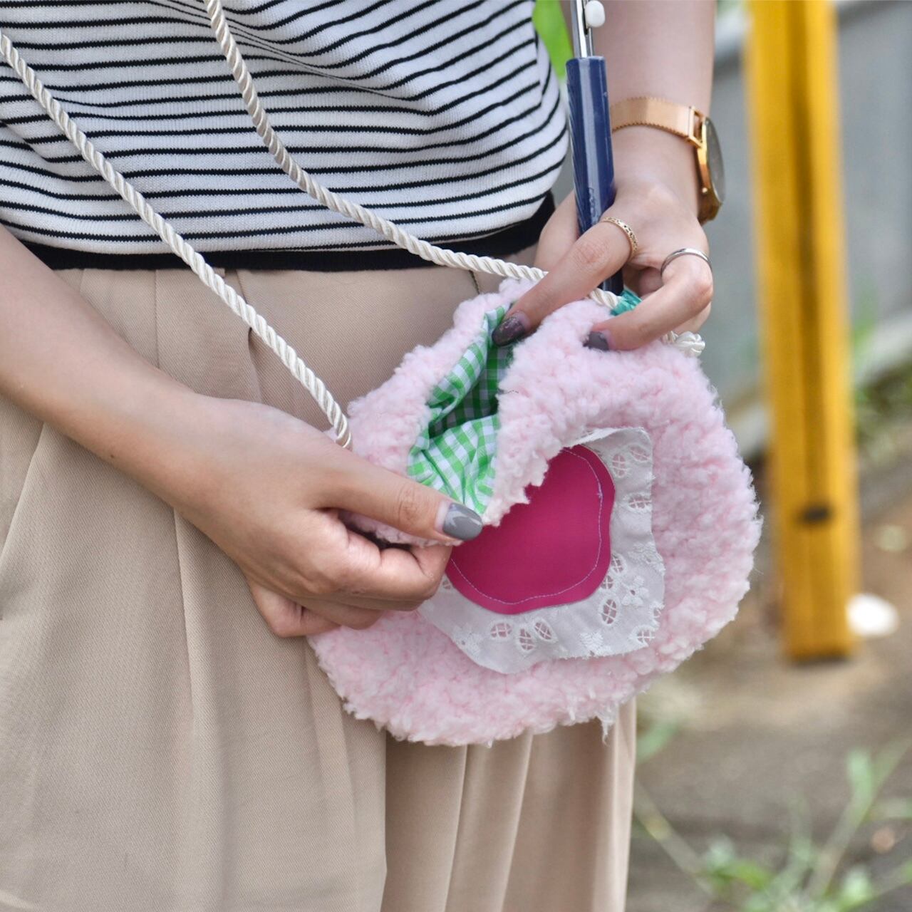 ピンクのふわふわ生地に丸底でとてもキュートなショルダーバッグです。裏地もチェックでかわいいに抜かりなく!コロンとしたフォルムがかわいい一品です。