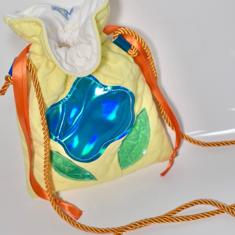 キラキラ輝く水色のお花に黄色のキルティングを組み合わせた巾着ショルダーバッグです。持ってるだけでハッピーになれそうな色味です♡