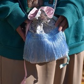 水色のフリンジが揺れる巾着ショルダーバッグです。