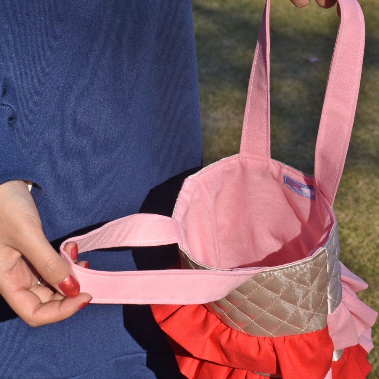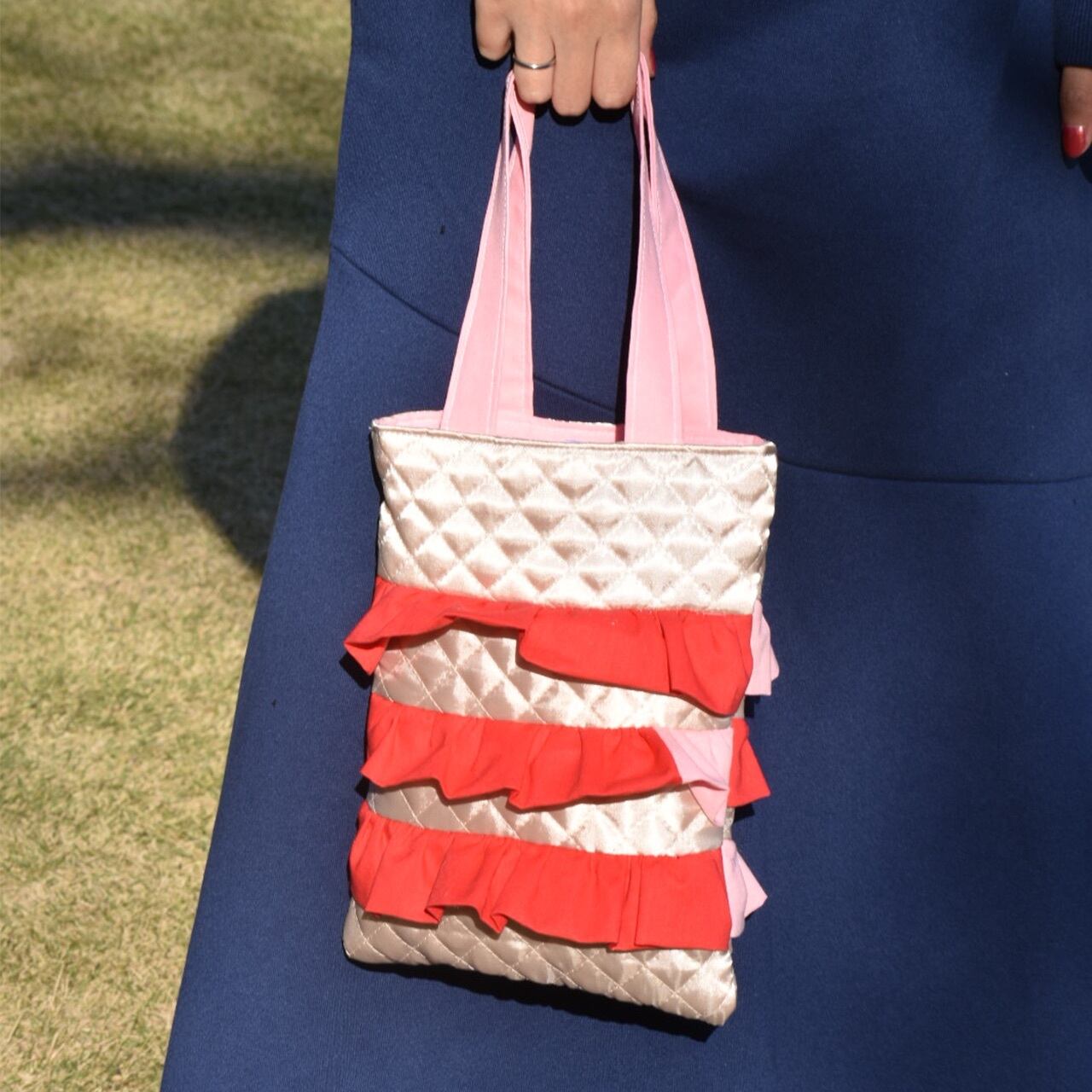 赤とピンクのフリルたっぷりトートバッグ