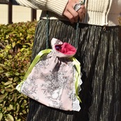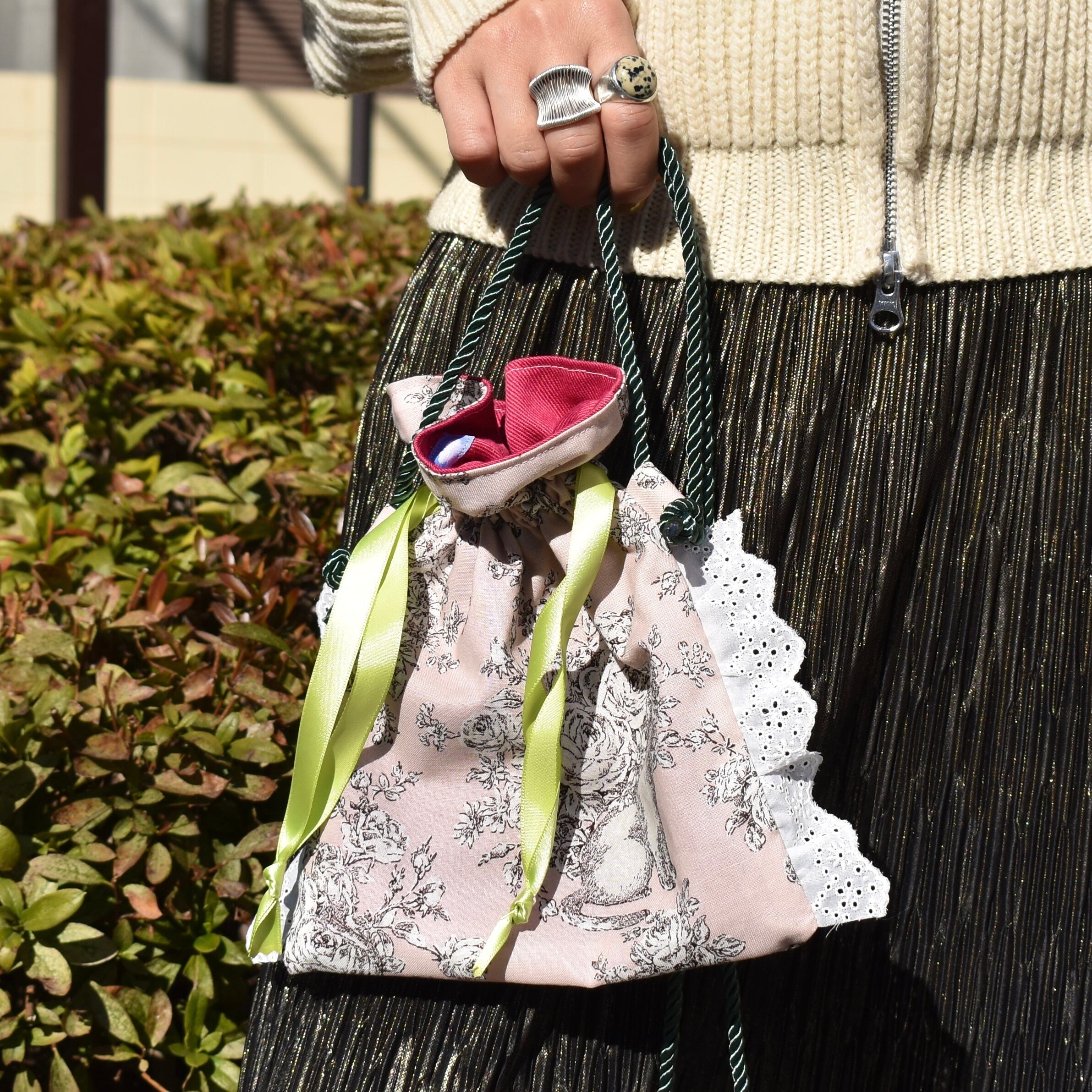 左右にレースをあしらった猫ちゃんの巾着ショルダーバッグです。可愛らしい色味とデザインですが、肩紐を緑にする事で甘すぎないデザインに仕上げました。
