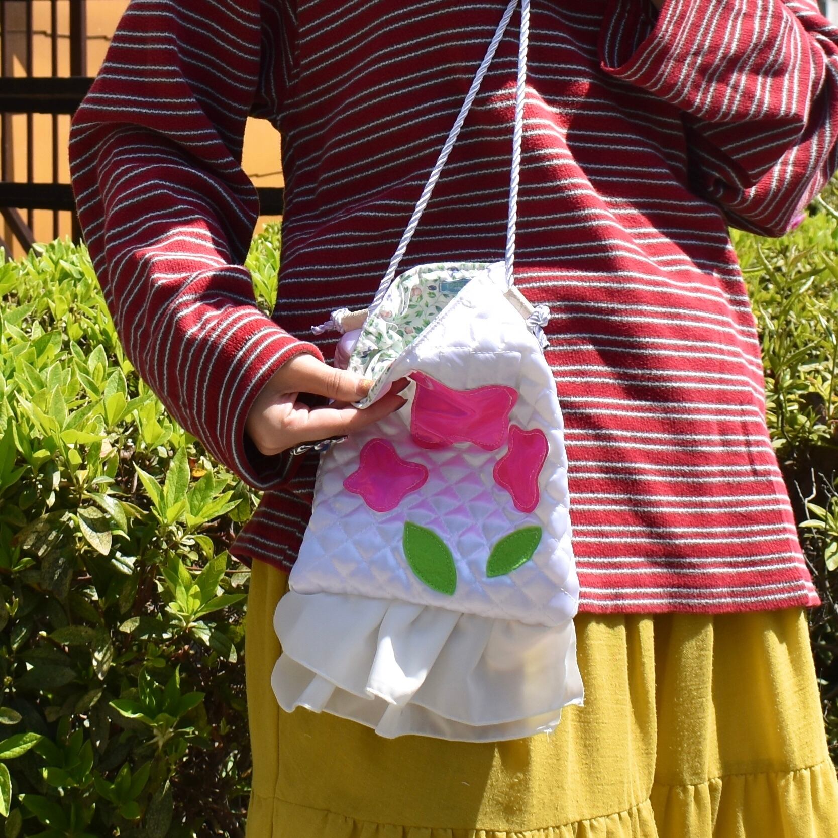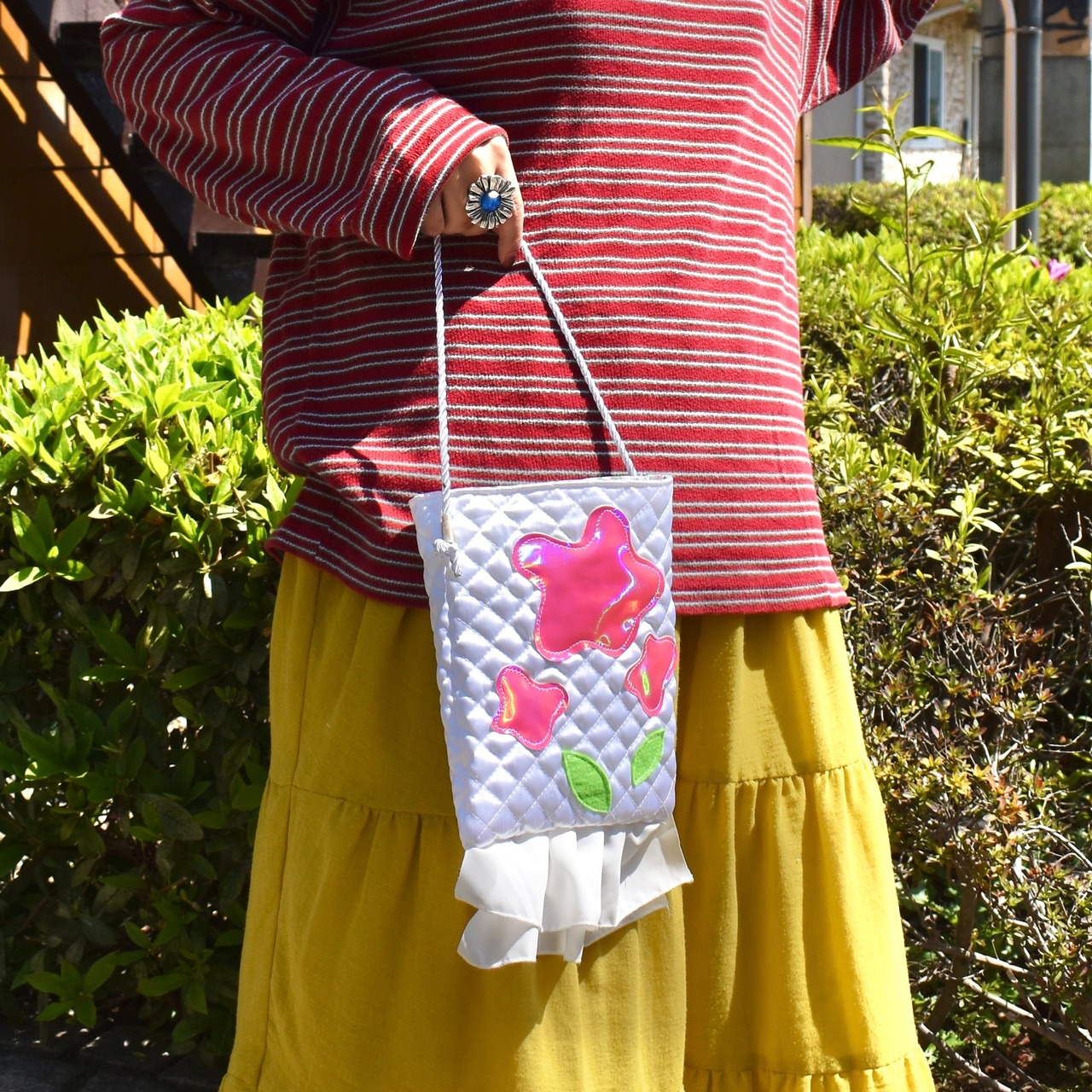 3つのピンクのお花がきらめくハンドバッグです。裏地もお花で溢れているのがポイント。