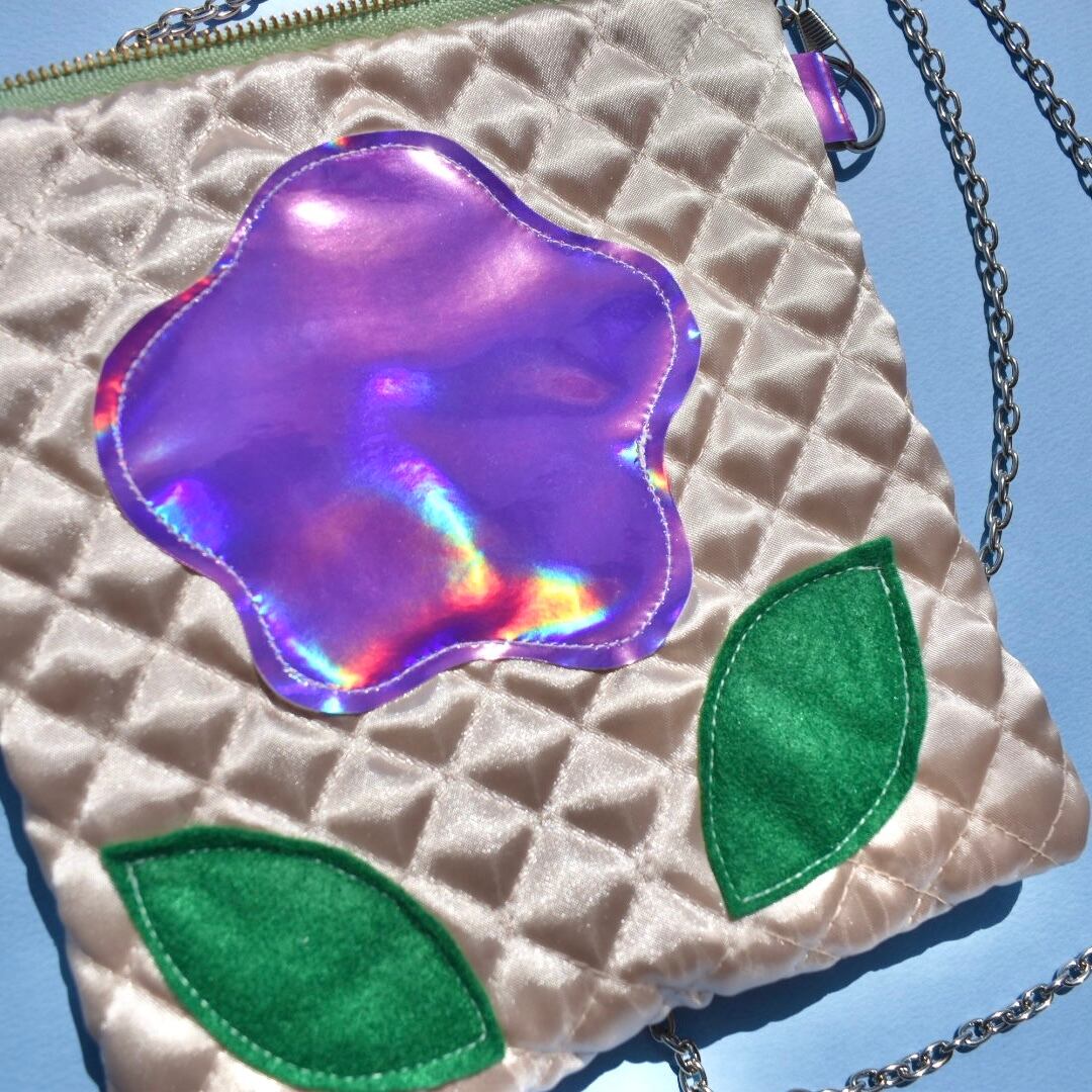 紫のキラキラなお花が輝くショルダーバッグです。大きめなお花が存在感抜群!ハッキリした色合いがファッションに花を添えてくれます。