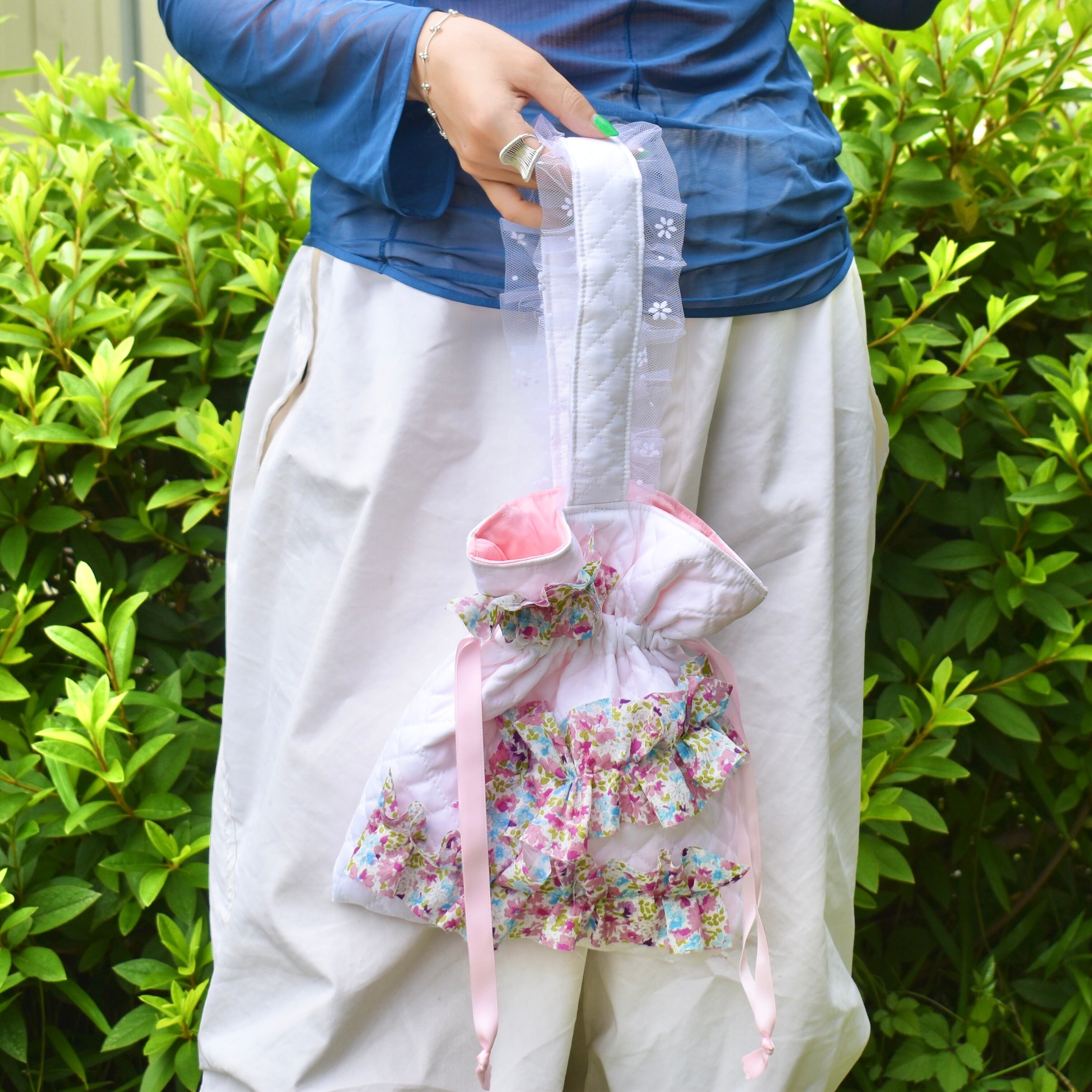 まっしろキルトとランダムフリルの巾着ハンドバッグ