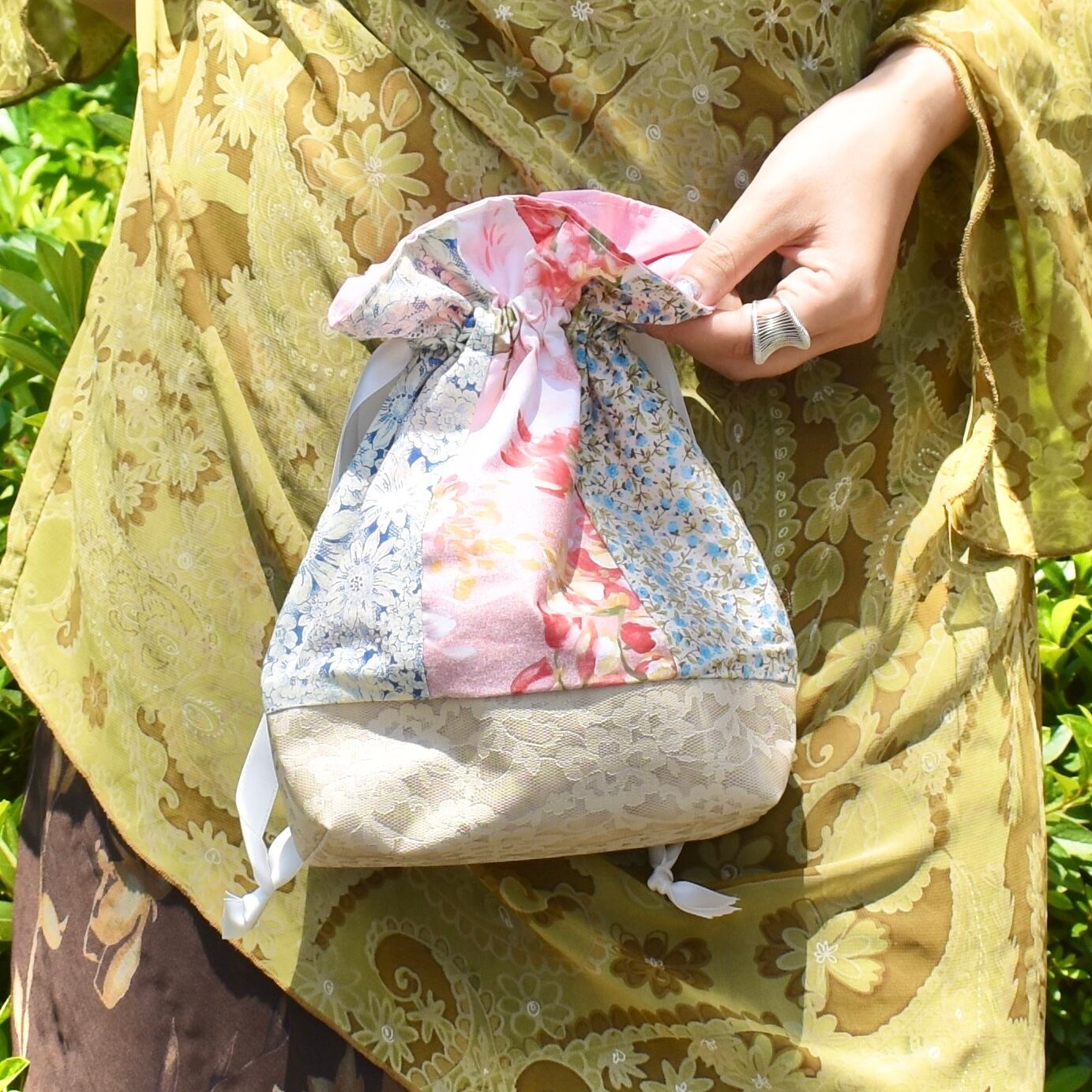 パッチワークのたくさんお花巾着ポーチ