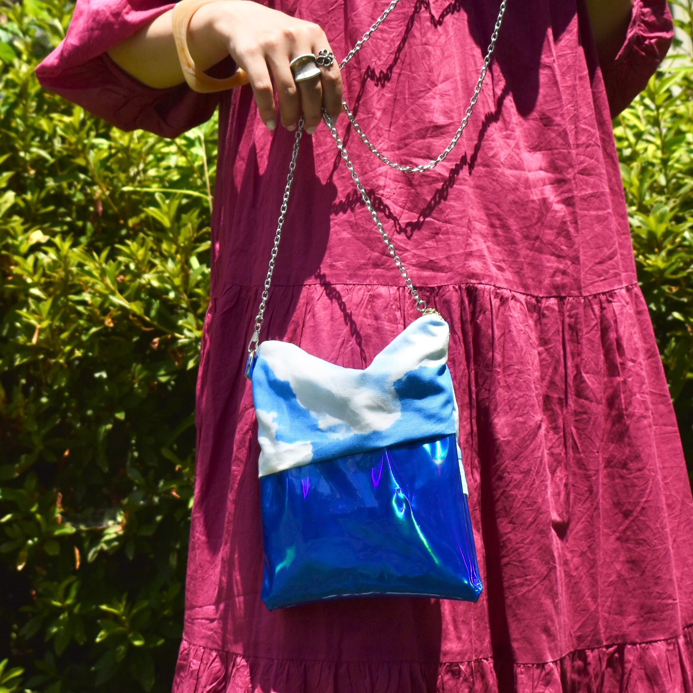 夏の青空のような鮮やかな青が差すショルダーバッグです。斜めに生地を縫い合わせたデザインと