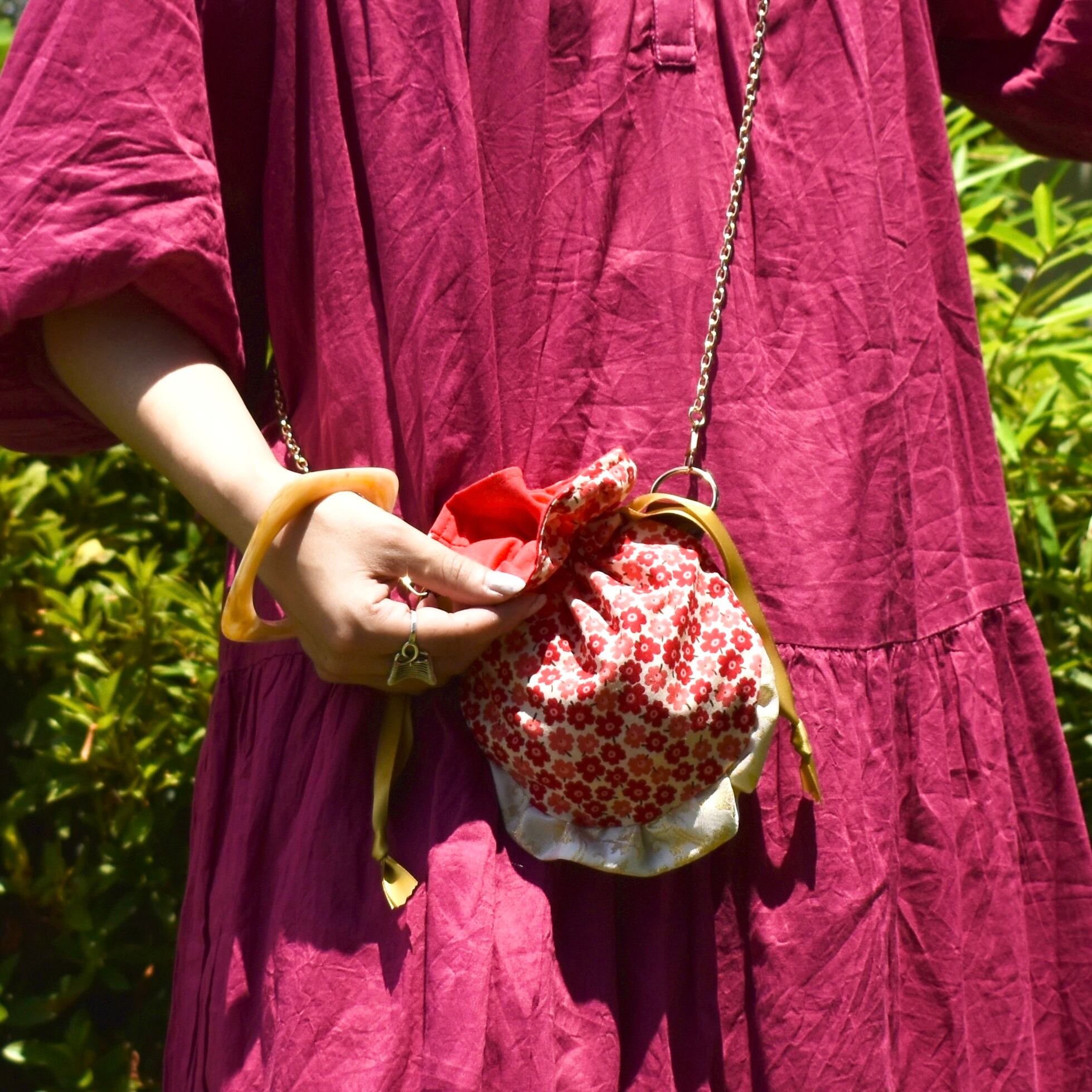 小さめサイズの丸底巾着ショルダーポーチです。少しレトロなお花柄ところんとしたフォルムが可愛い!底にフリルを入れたのもポイントです。