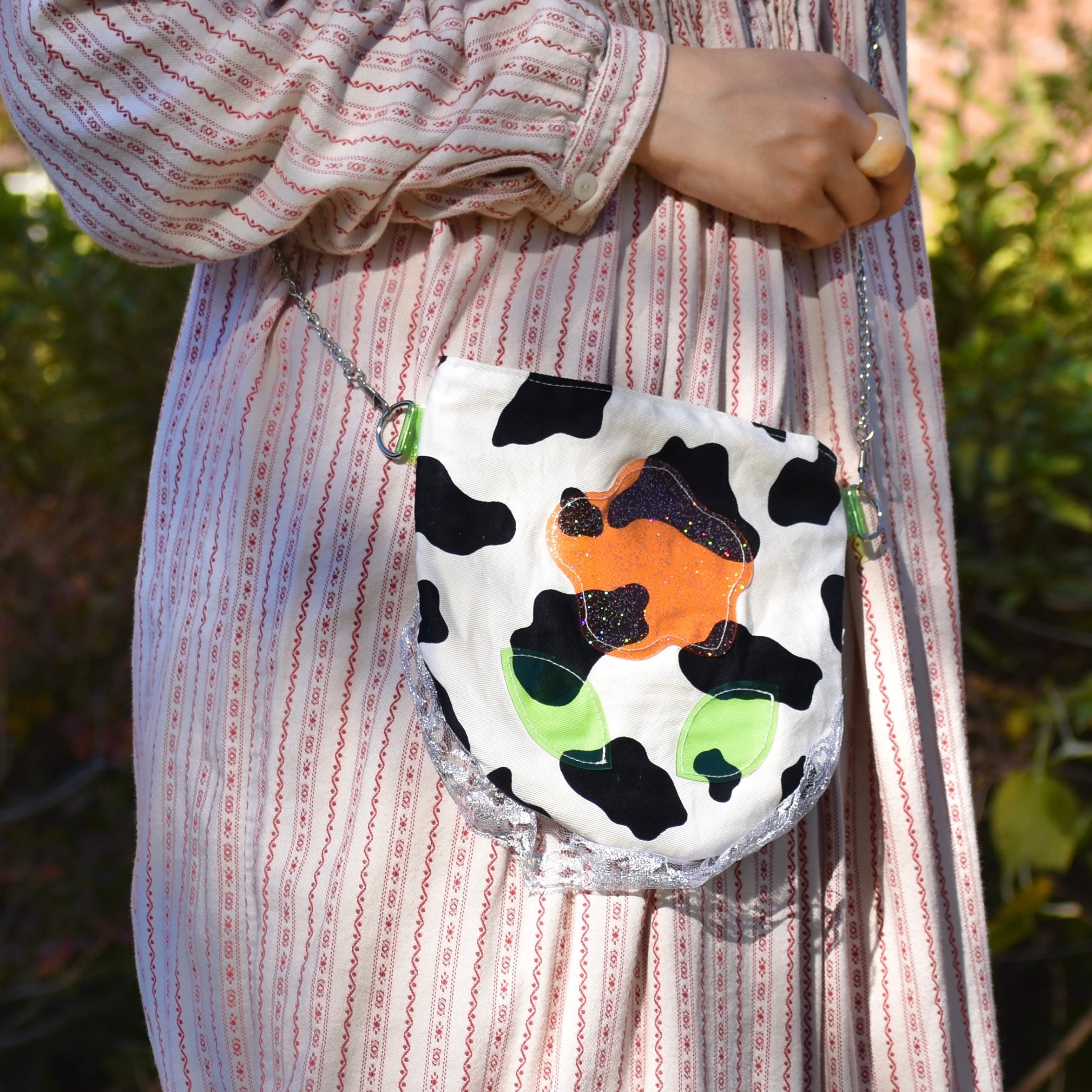 牛柄のキラキラお花の丸底ショルダーバッグ