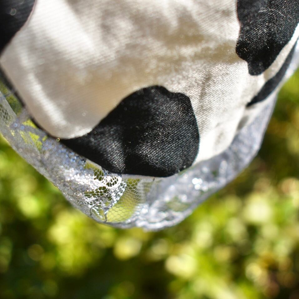 牛柄の生地の上からキラキラのお花をあしらったショルダーバッグです。底を囲むようにつけたレースもお日さまの下でキラキラ輝きます。