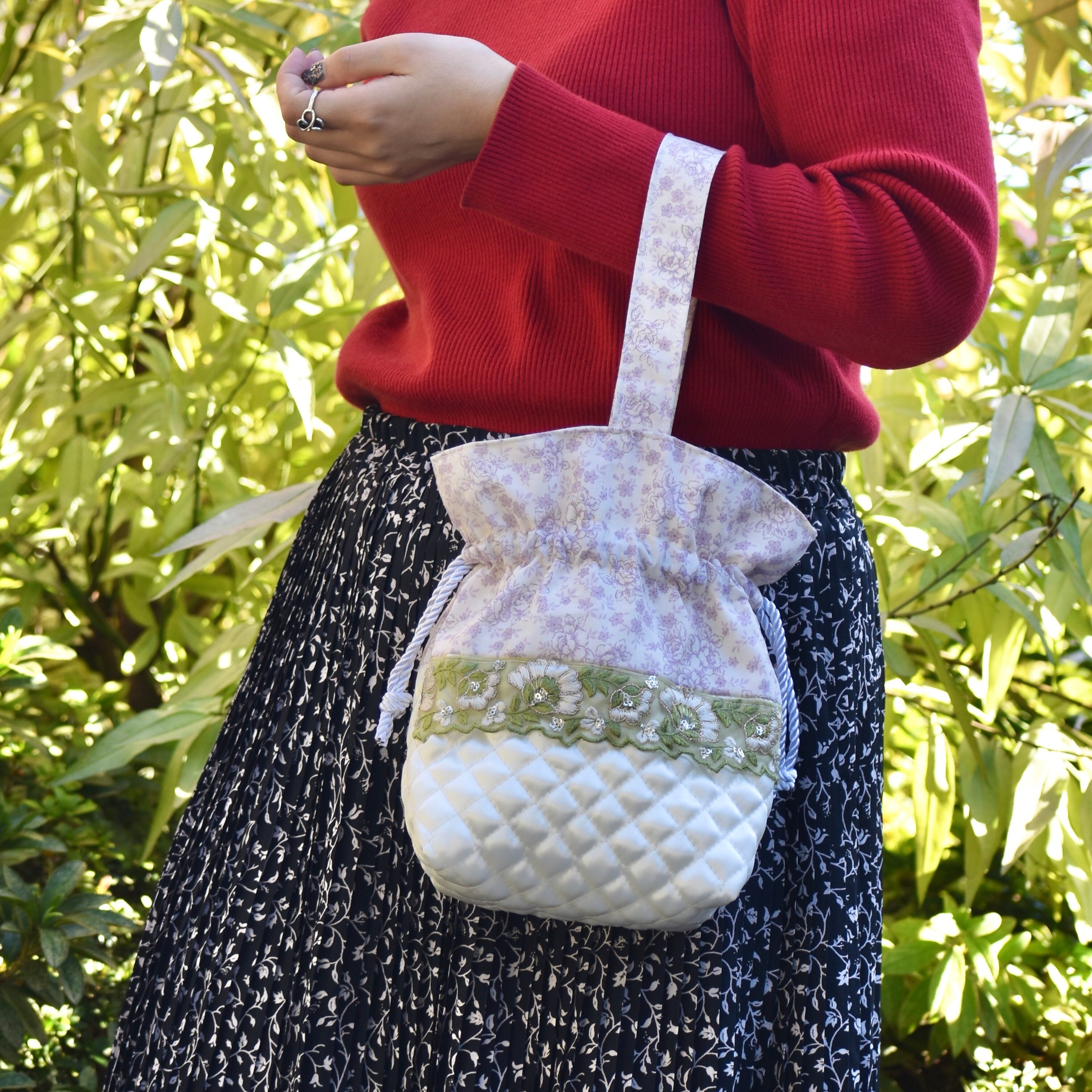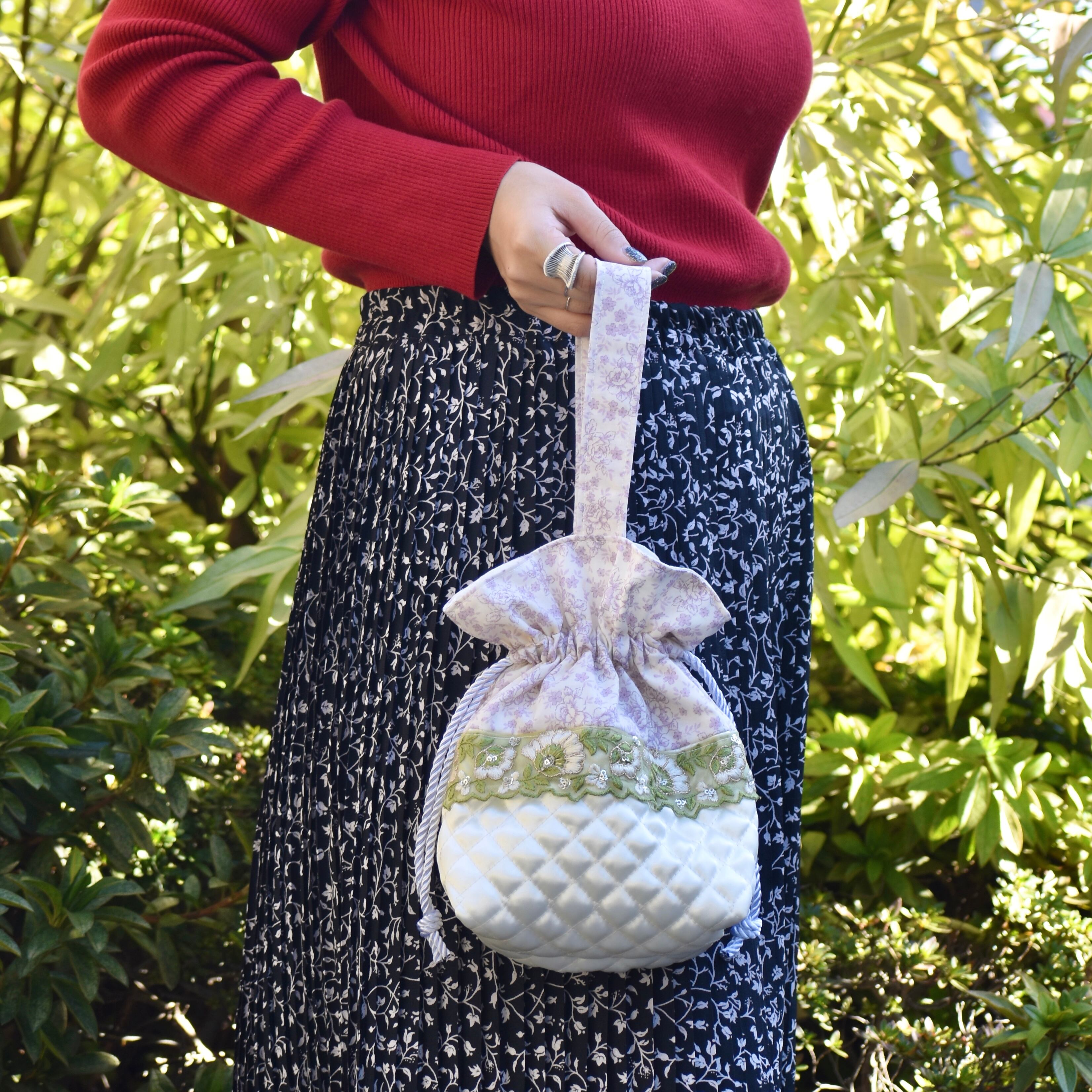 柔らかい質感と色合いの生地を使った巾着ハンドバッグです。マチありでコロンとしたボディの形が可愛いです。