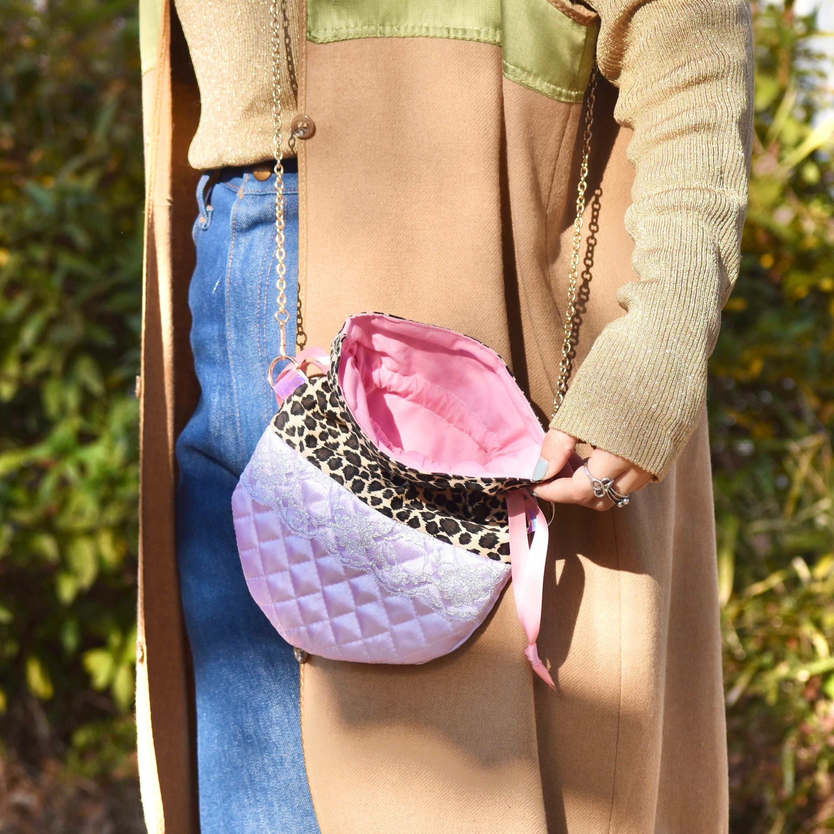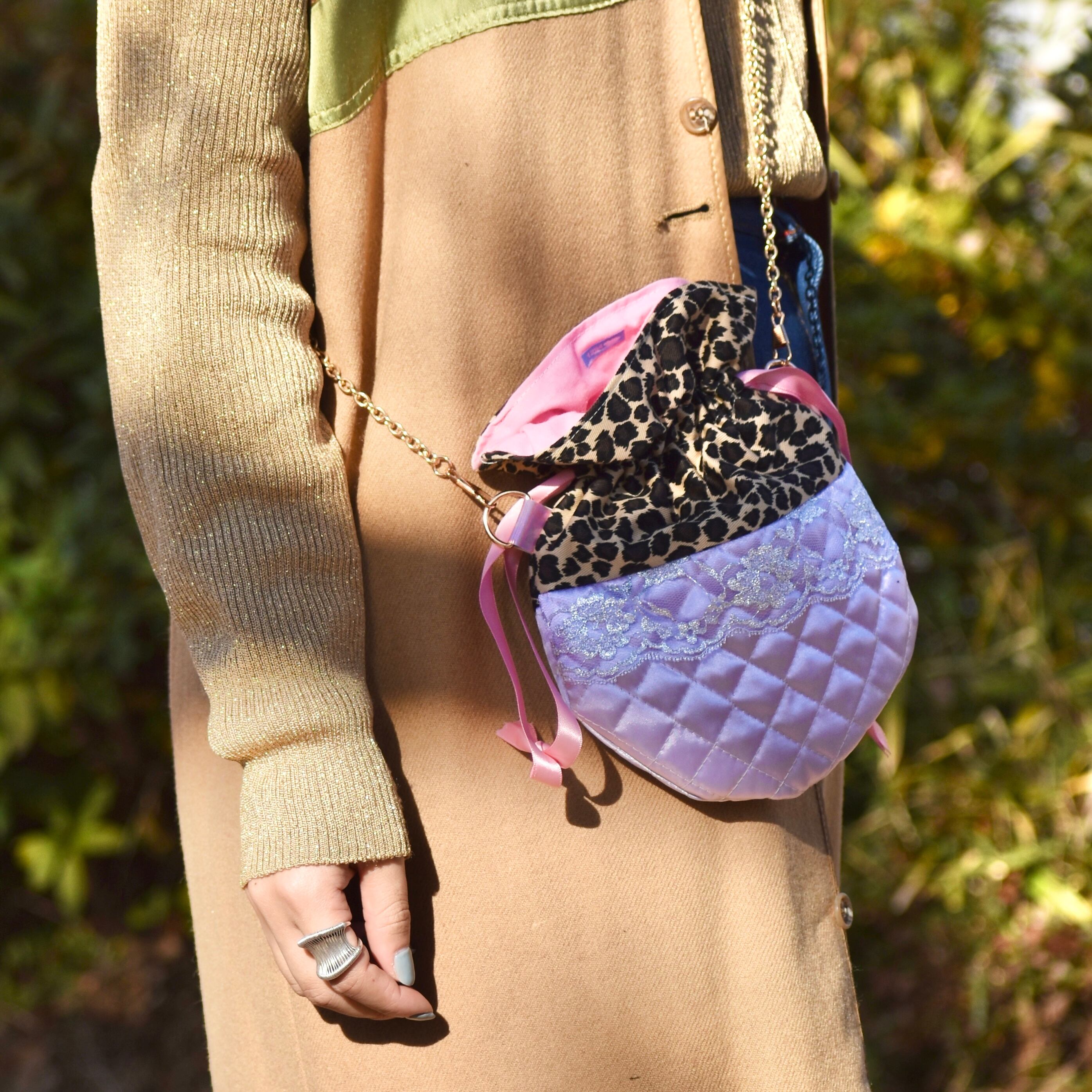 レオパード柄とキルティングの巾着ショルダーバッグです。