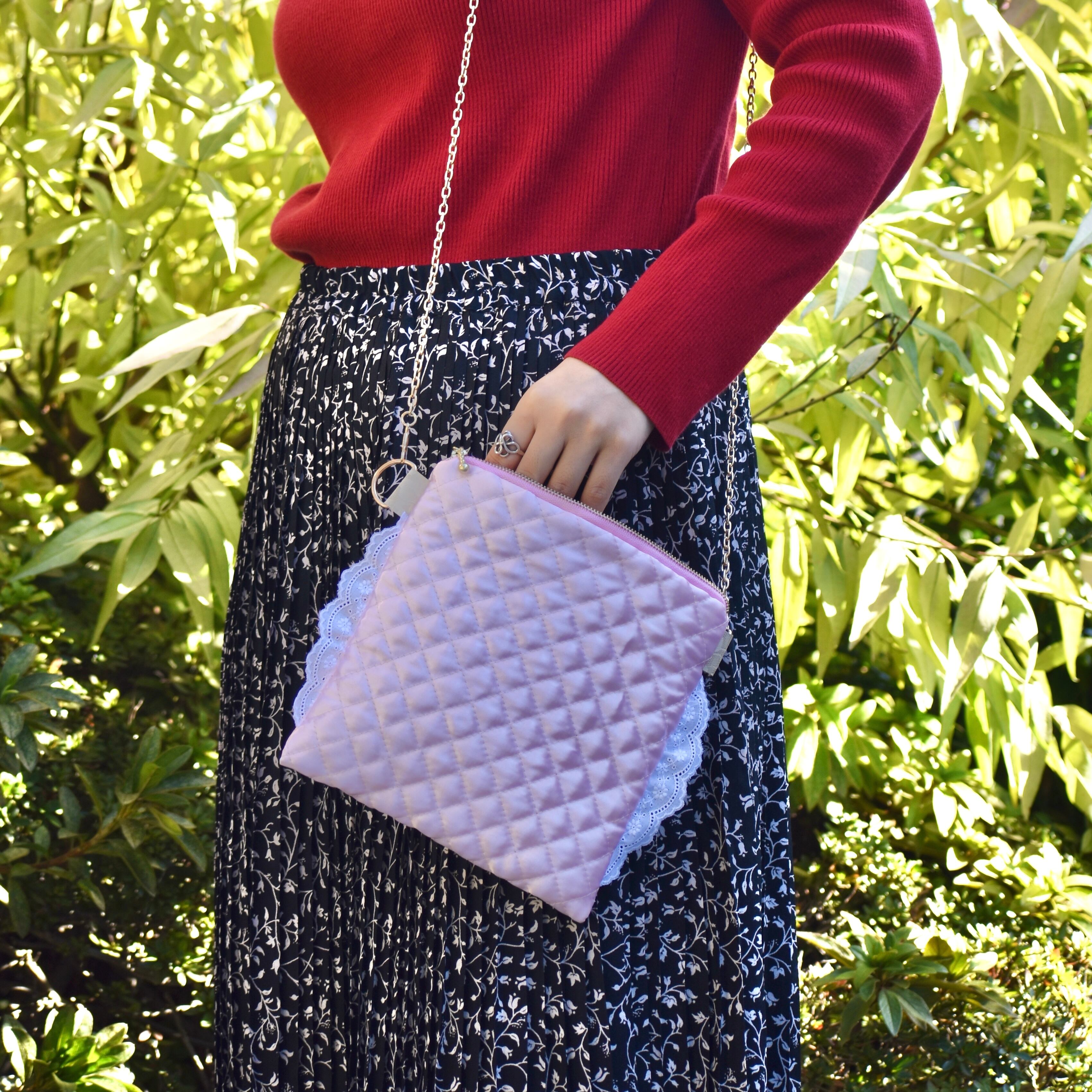 手書きのお花をあしらったショルダーバッグです。紙にアクリル絵の具で花を描いた上からビニール生地で縫い付けました。