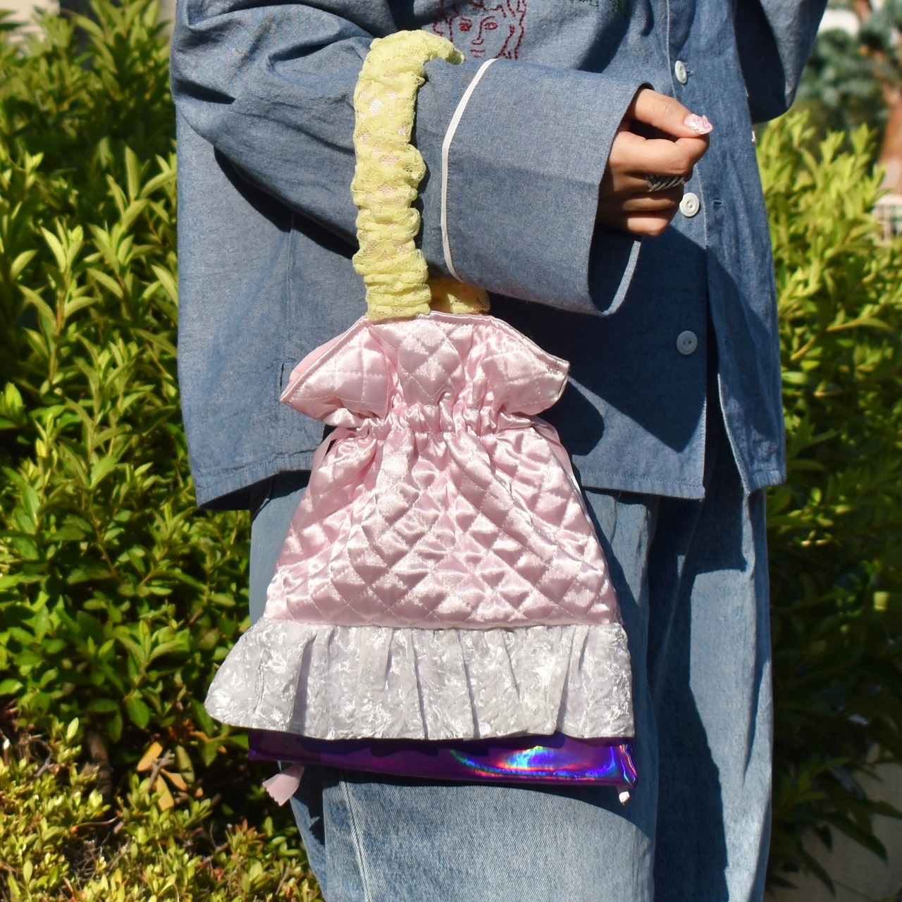 持ち手部分をふわふわなフリルで覆った巾着ハンドバッグです。