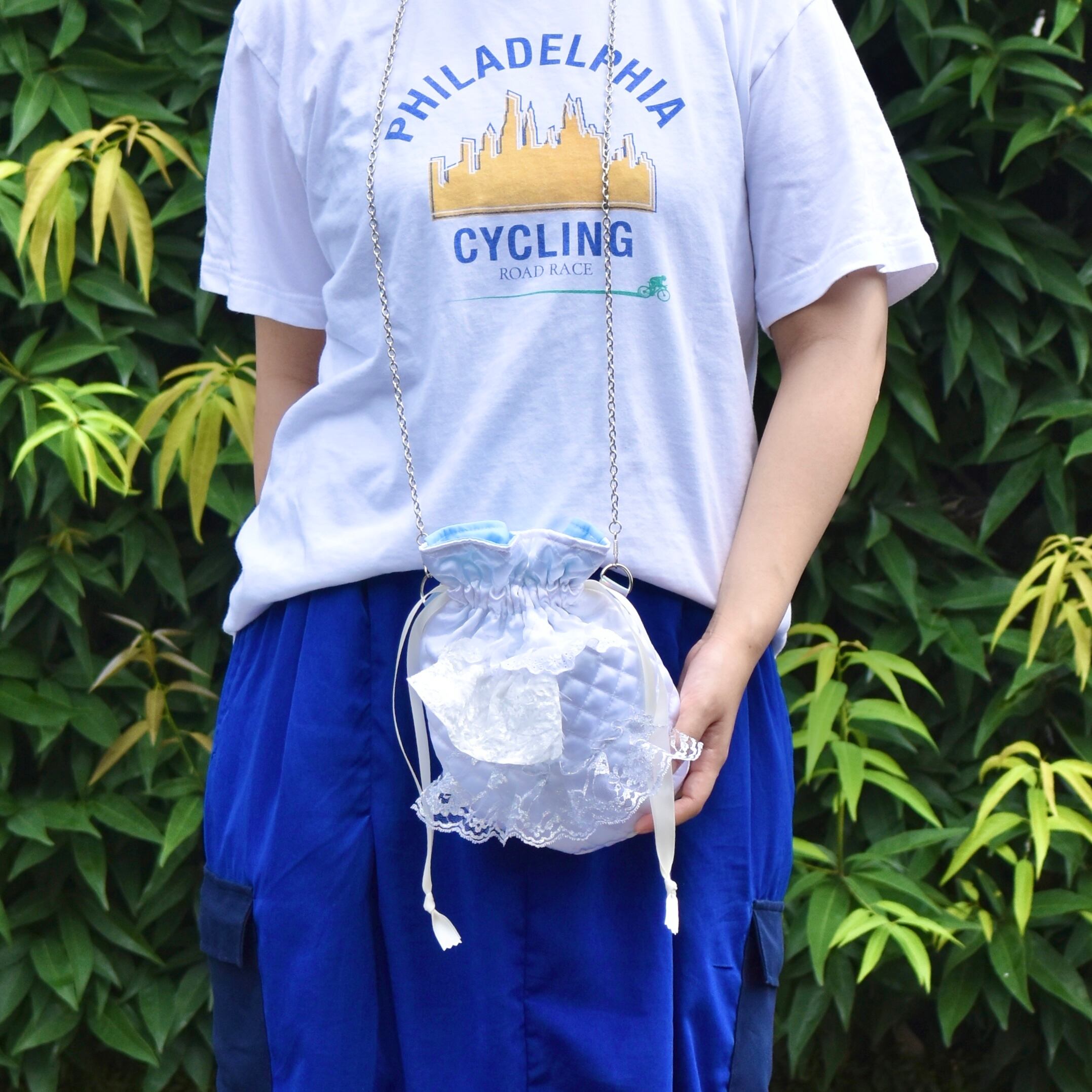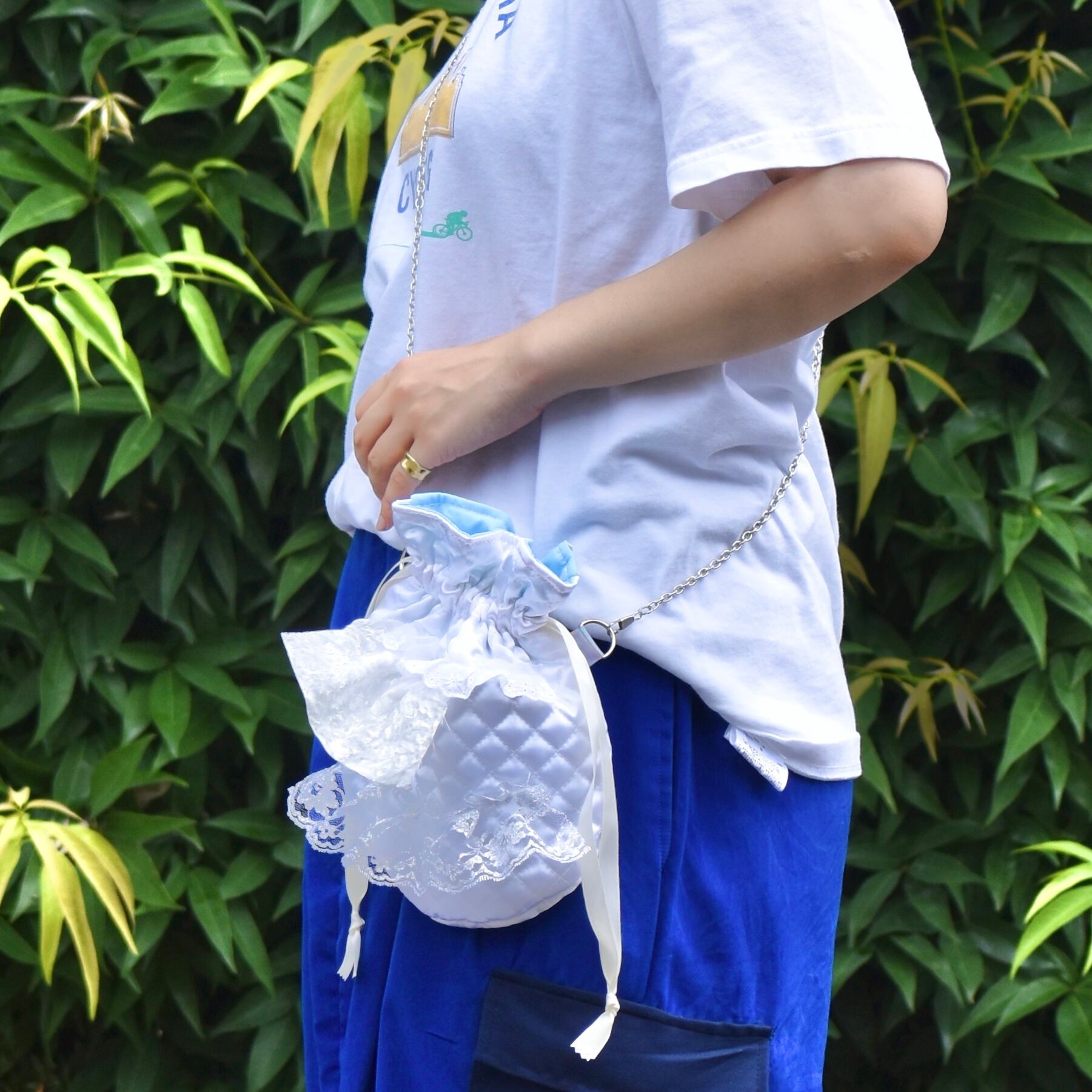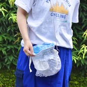 レースがたくさん白い巾着ショルダーバッグ