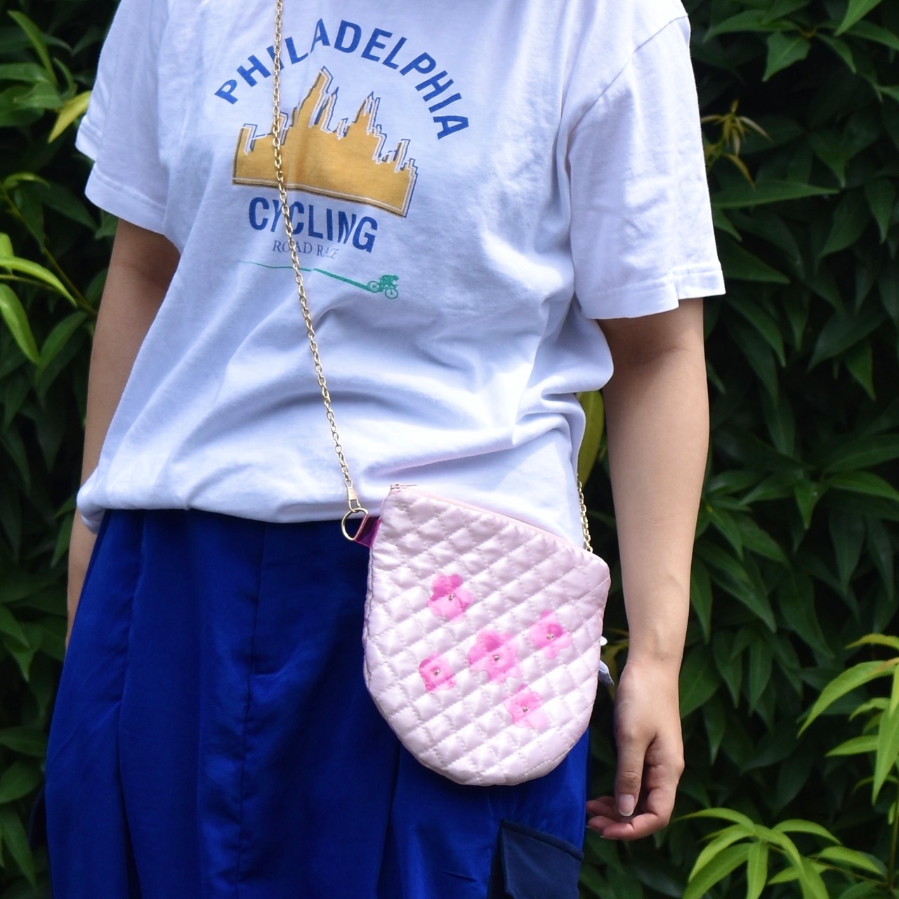 ひらひらと半透明のお花がついたショルダーバッグです。ちょこんとしたお花のサイズ感にこだわりました。お花は1つ1つビーズで縫い付け、丸底で可愛らしく仕上げました。