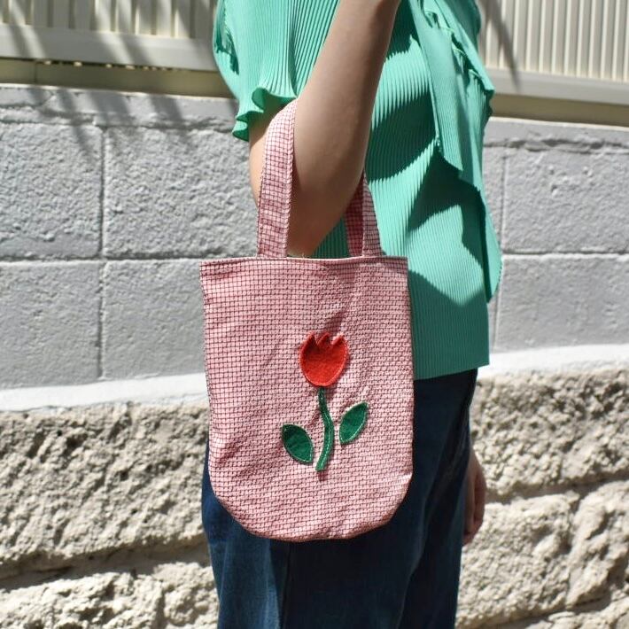 赤いチェックにチューリップのモチーフをつけたトートバッグです。