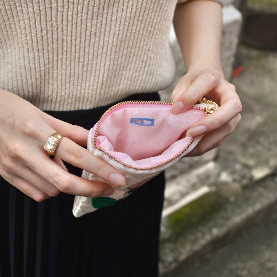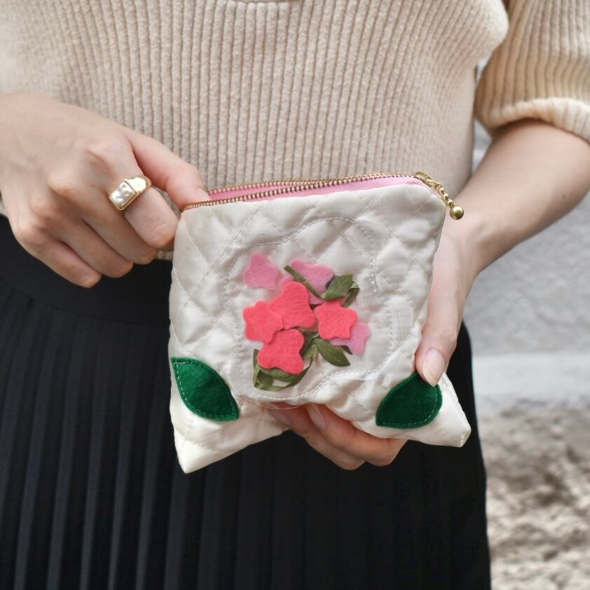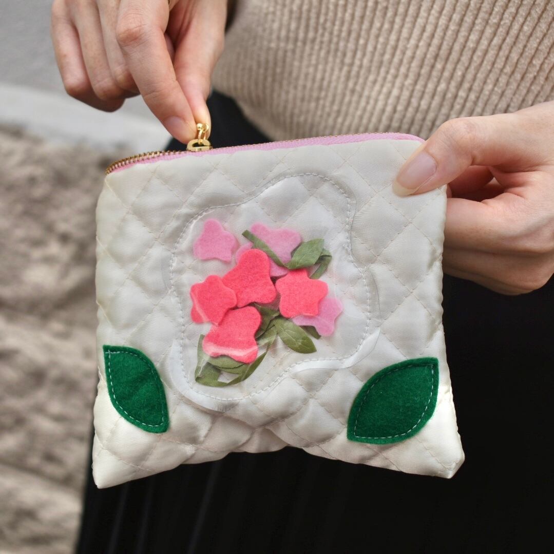 フェルトのお花たちをたくさん閉じ込めたファスナーポーチです。やわらかい素材を使って優しい雰囲気のポーチに仕上げました。
