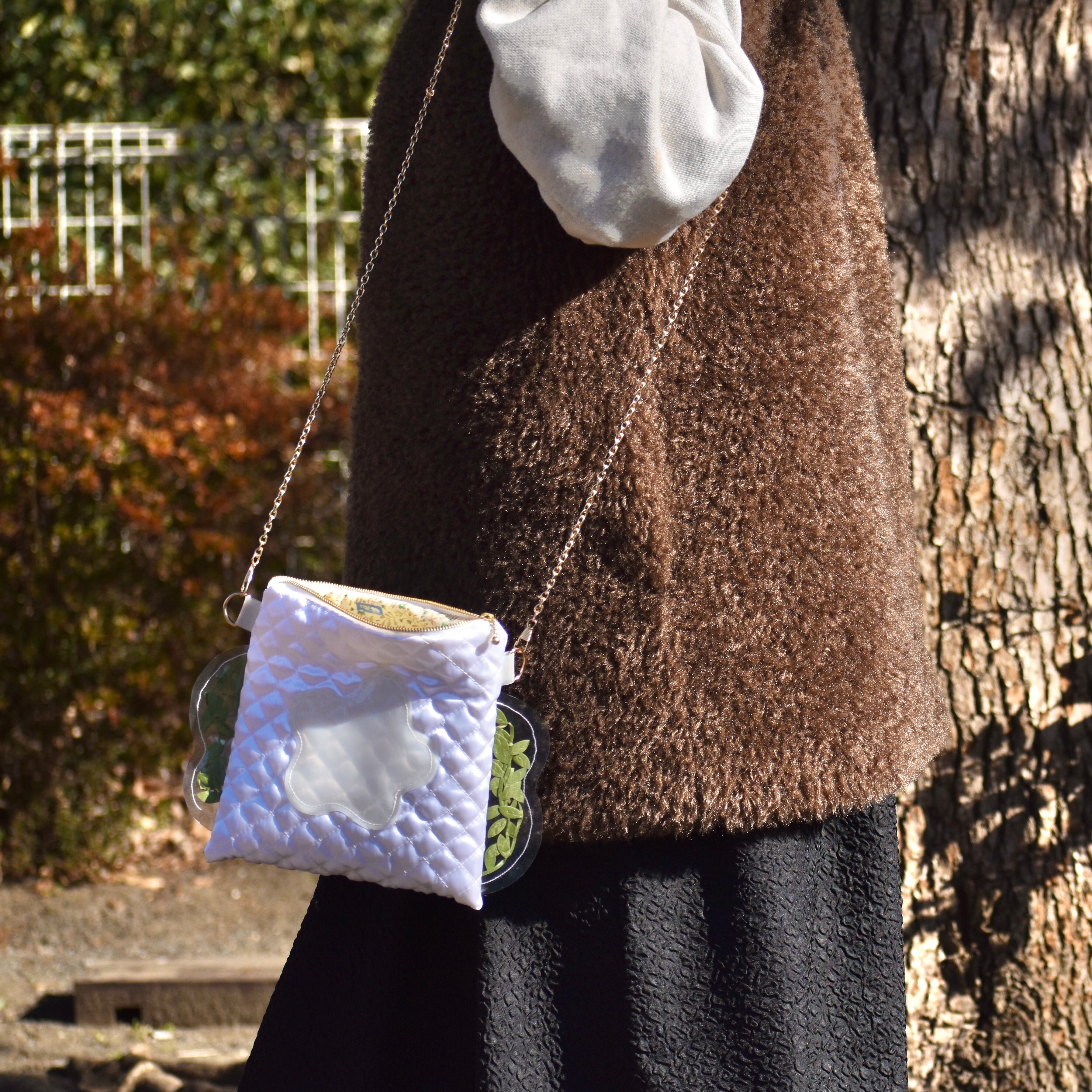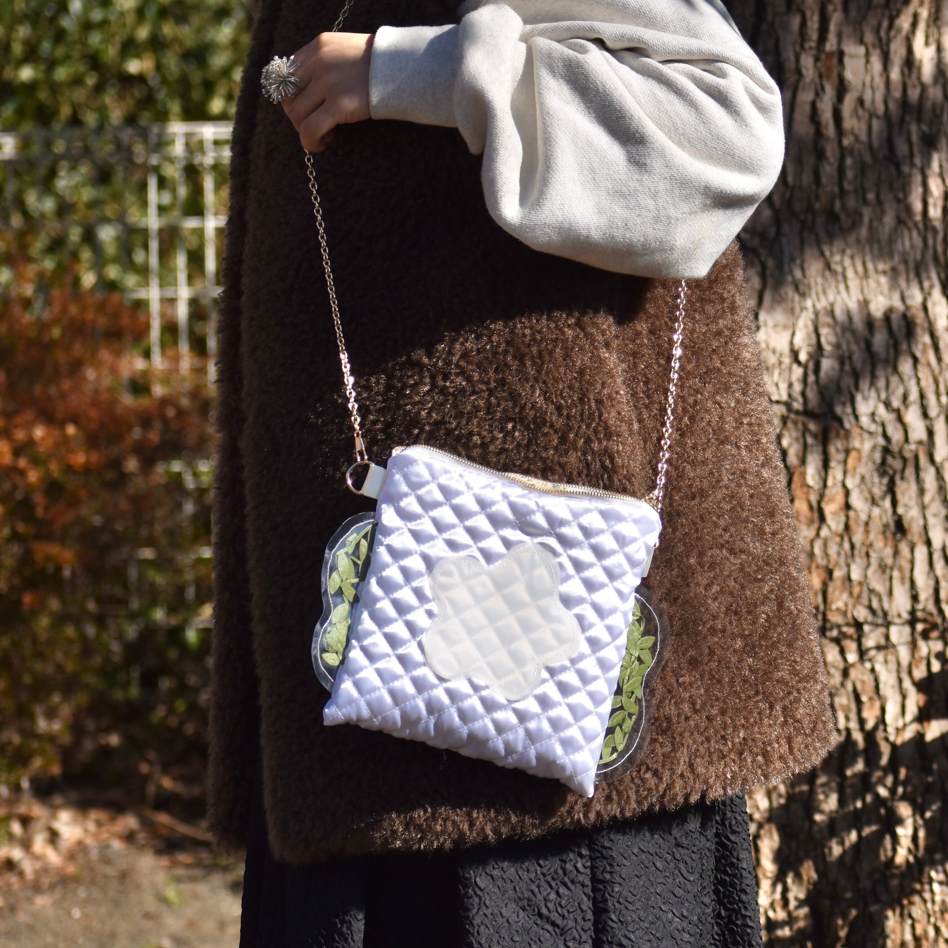 乳白色のお花とサイドに蔦のような草を閉じ込めたショルダーバッグです。
